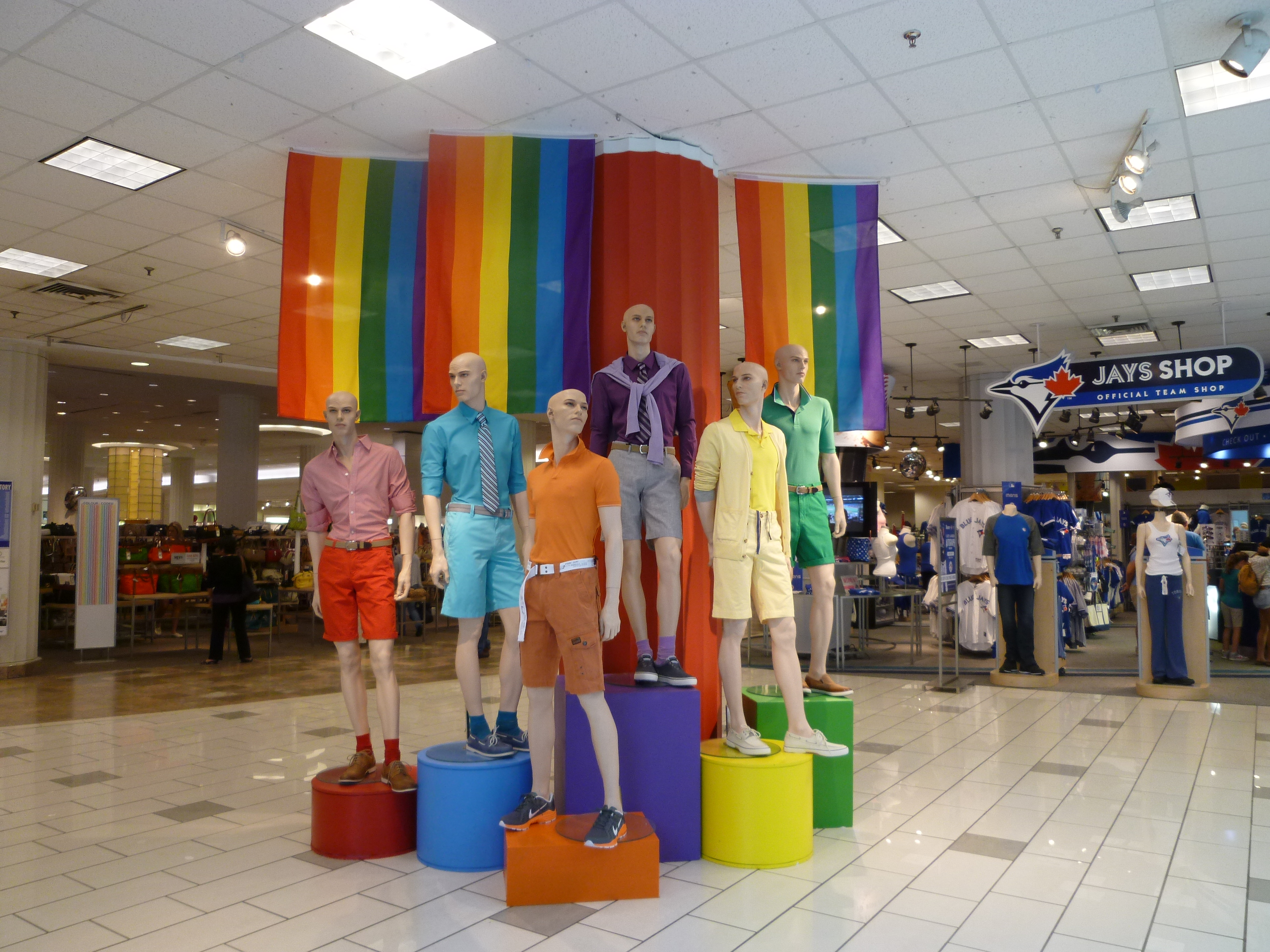 トロント市庁舎、王立オンタリオ博物館といった公的機関はもちろんのこと、大手銀行や大型ショッピングモールなど街の中核を担う商業施設、マクドナルドやサーティーワンアイスクリームなどメジャーなファストフードチェーンや個人レストラン、個人の邸宅やマンションなど、街中にレインボーフラッグが掲げられる。街全体が性的マイノリティを祝うのである。