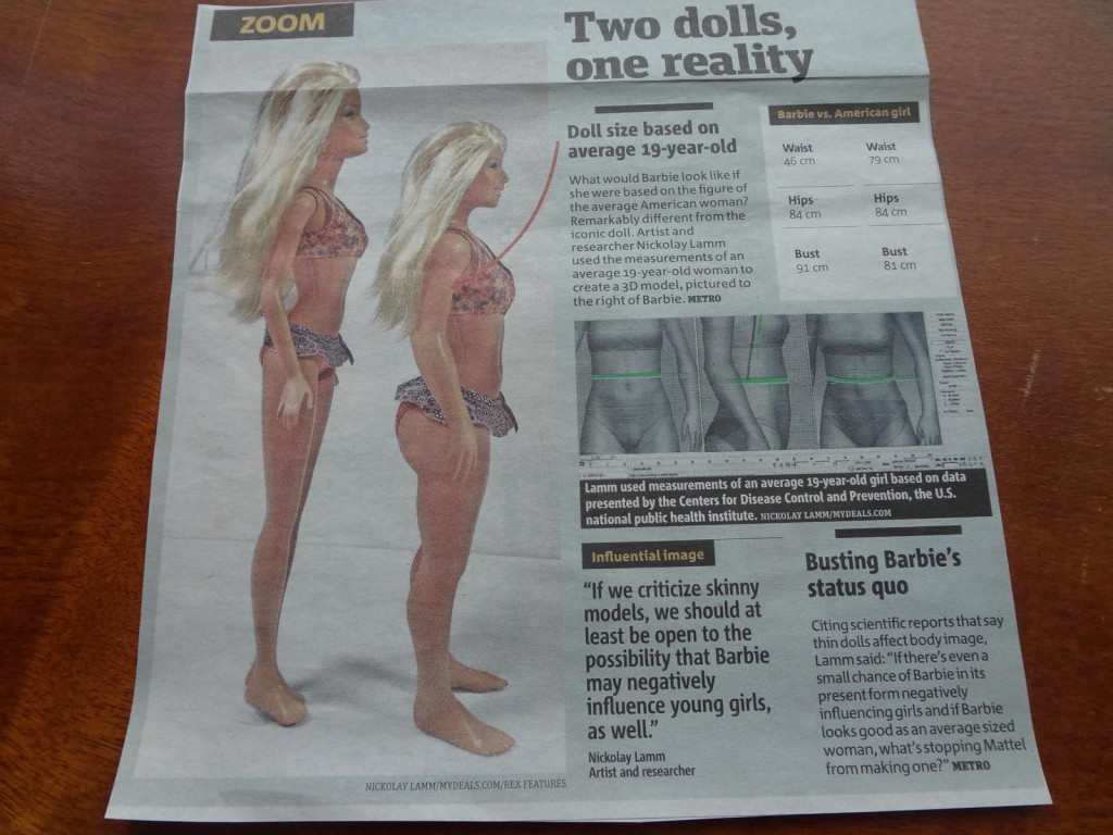 実社会ではこのように肥満人口増加が問題視される一方だが、玩具業界では、理想に近づきたいという欲望を反映してか、50余年もの間あり得ない体系のバービードールが売られ続けている。違和感を覚える人は多いようで、米国の某アーティストは、最近19歳の平均的アメリカ女性の体型数字を元に右側の人形を制作した。