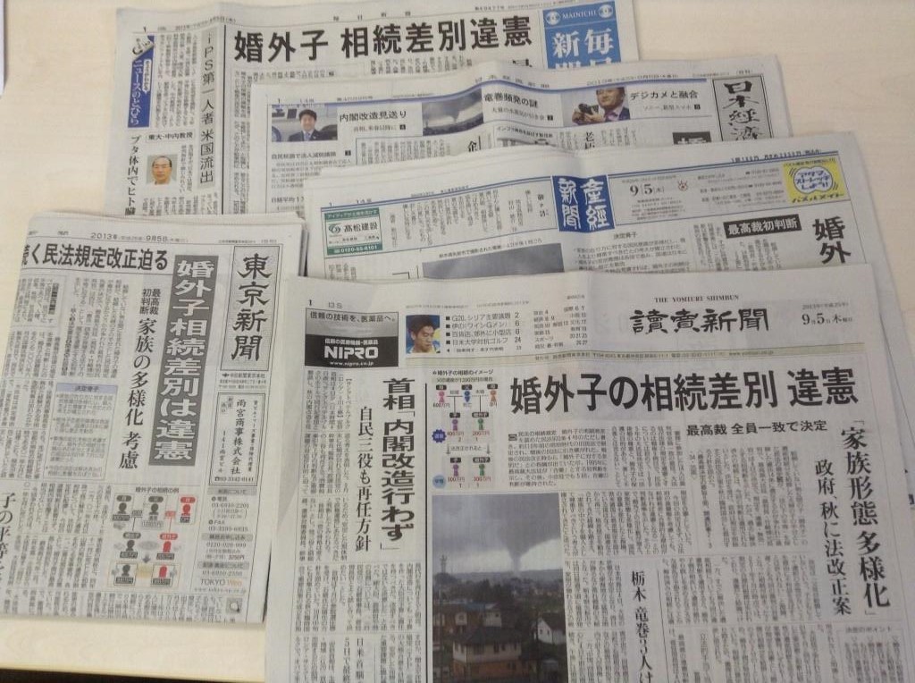 日本にいる人はご存知だろうが、9月5日、主要各新聞紙の1面には同じ見出しが躍った。「婚外子の相続差別違憲」