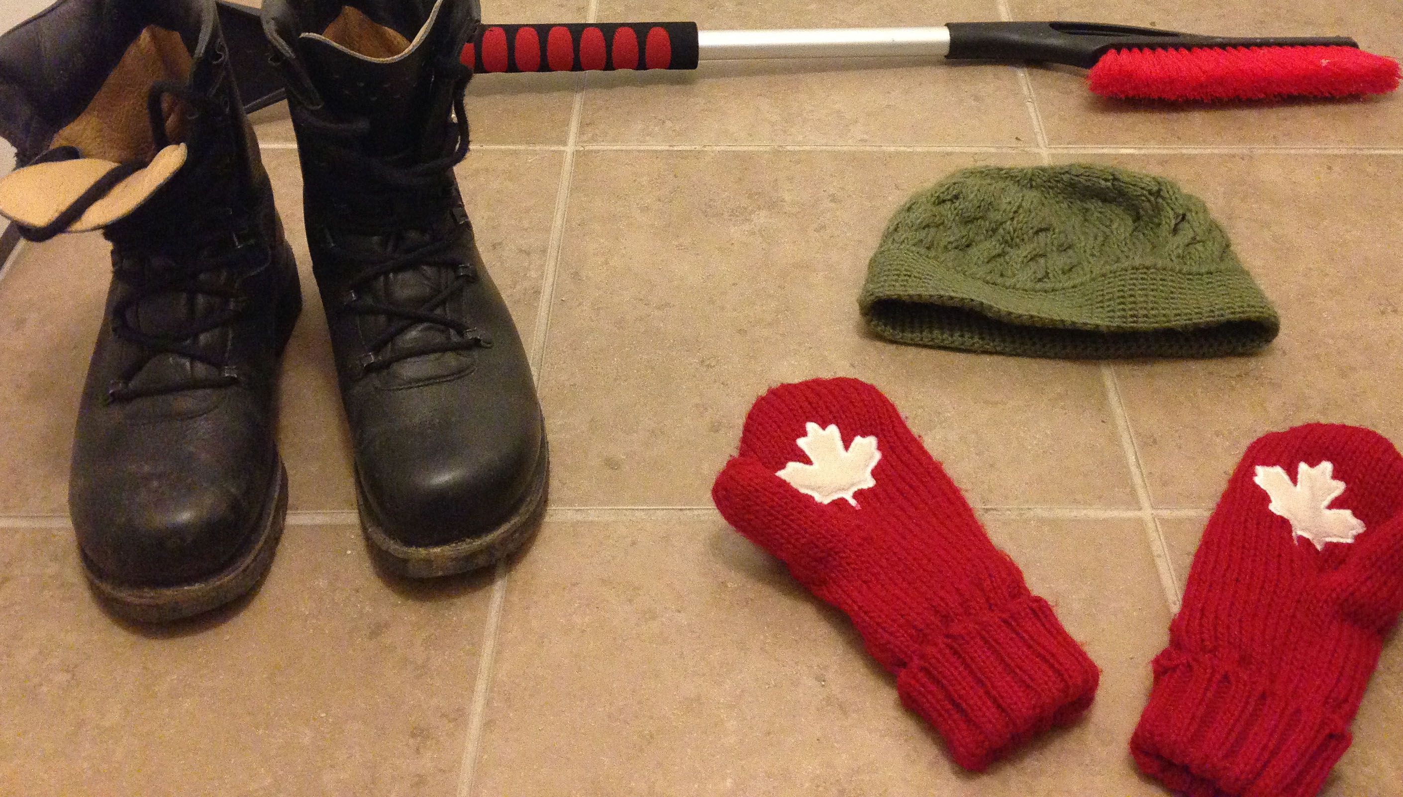 トロントの冬を乗り切るためには、ぬかりなく冬の支度をする。一番向こうにあるのは車に積もる雪を取り除くもので、片方がフライ返しのような形状になっていて氷をガリガリこすって除く。この緑の帽子はカナダ英語でtuke(トゥーク)と呼ぶ。ピチっと頭にくっつくので暖かい。