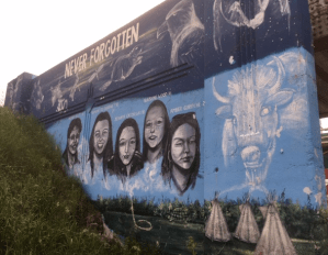 マニトバ州ウィニペグ市のダウンタウンの高架に描かれた殺害・失踪した先住民女性の記録