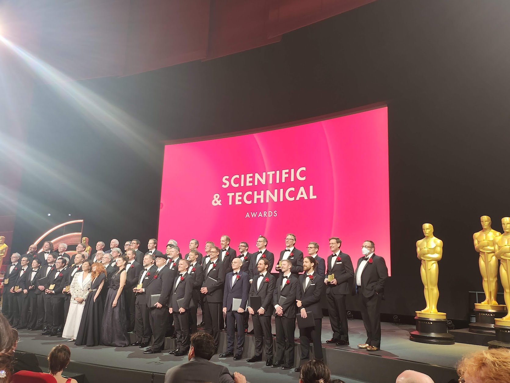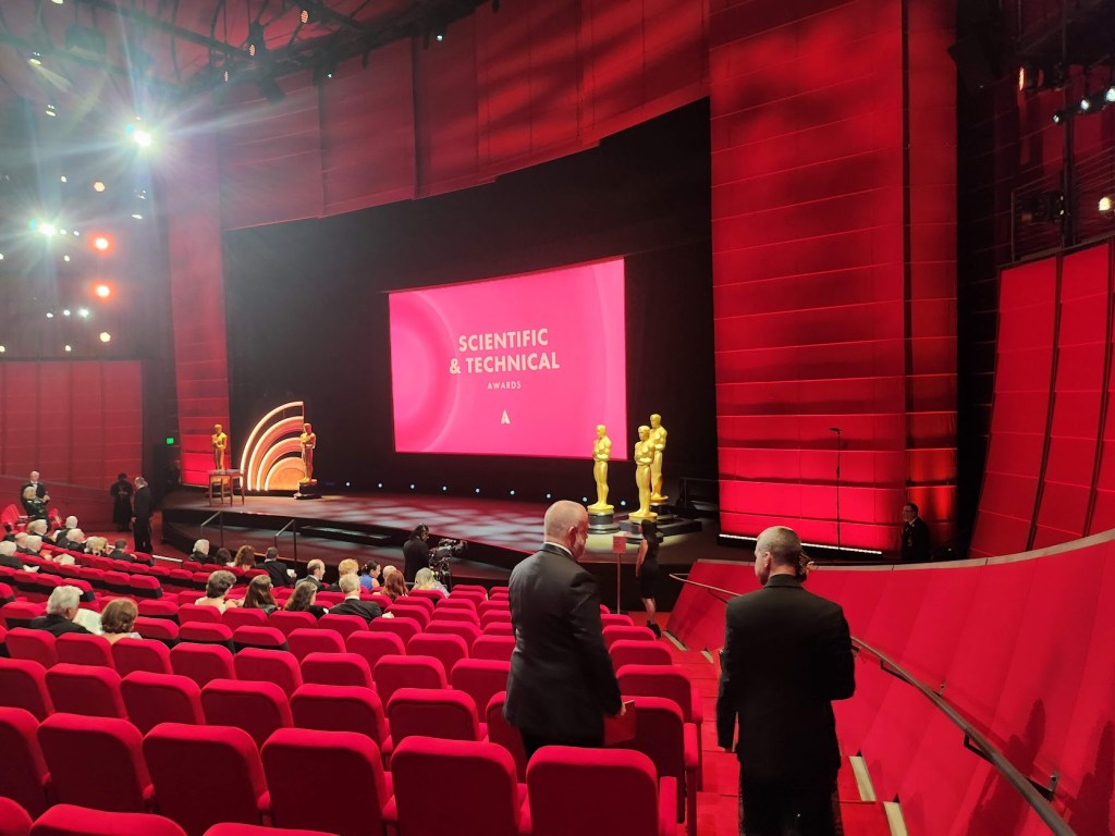 科学技術賞は映画製作をより優れたものへと導いた技術を公認し讃える賞であるため、一つの映画ではなく、長年映画業界と関わって蓄積と貢献が認められた団体や個人へ授与される。そのため、科学技術賞では全員がすでに受賞が決定しているので会場内は「長年の功績が認められて嬉しい」といった雰囲気で満ち溢れている。そして光栄にも今年、夫が二度目となるアカデミー科学技術賞を受賞した。2018年に初めて受賞した時の報告をこのサイトでさせていただいたが(注1)、その時はホテルが会場だったが、今回はアカデミー映画博物館シアターで行われたので違った体験となり、その感想を改めて述べたいと思う。
