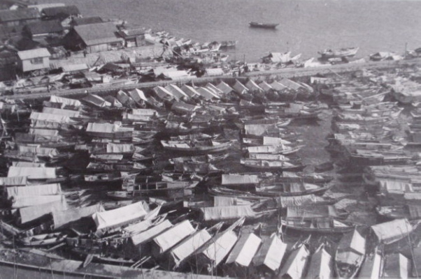 家船とは、まさに船が家であり、そこで生活をしていた人たちの事を指す。家族ぐるみで船に住み、海上漂泊生活をしていた。このような海上生活者たちは昔から各地にたくさんいた。ある由緒書からは神功皇后から海のどこででも漁獲することの許しを与えられたという説話があるほか「吉和太鼓踊り」(広島県指定無形民俗文化財の一つ)の伝承は足利尊氏からどこでも漁ができる特権を与えられた漁師たちが喜んで踊ったことが始まりであるとされている 。(注1) これらは古来から海上生活者たちがいたことを示してくれるが、ただ家船に纏わる文献が乏しいため歴史的にどのような生活を彼らが過ごしていたのかは未だ明らかではない。一説では家船にも率いる首長が存在して、掟を守って集団暮らしをし漁だけでなく軍事行動にもすぐれていた、とある。(注2) 足利尊氏の伝承からも伺えるように戦に参加した家船集団がその功績として漁業権を得たのであろう。これは、戦国時代に大きな勢力を誇示した村上海賊など瀬戸内などに多く存在した「海賊」と関係するのだろうか?興味が尽きない。